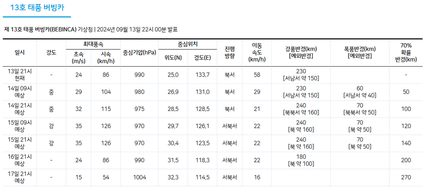 13일 기상청에 따르면 태풍 '버빙카'는 이날 오전3시 기준으로
